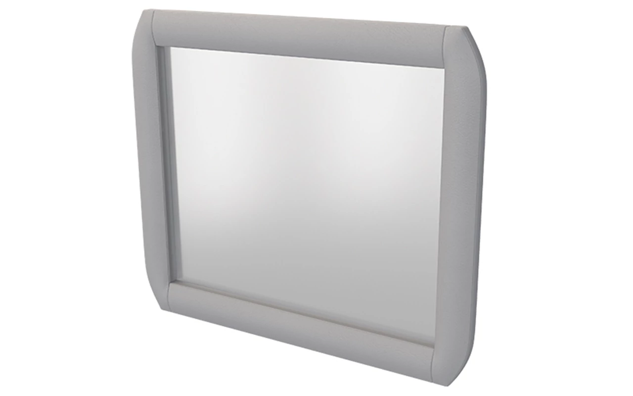 - В мягкой оправе: для спальни многие выбирают модели в раме из эко-кожи или мебельной ткани, так как эти материалы отлично сочетаются с обивкой кровати. Вы запросто подберете такое зеркало в необходимом материале тон в тон кровати, дивана, тумб или комода. Производители изготавливают зеркала в эко-коже и мебельной ткани различных форм и размеров, оправа может иметь дополнительный декор в виде стежки, страз, пуговиц или декоративных гвоздиков.